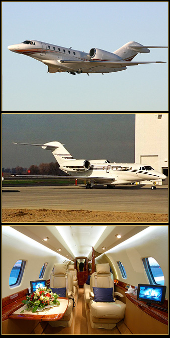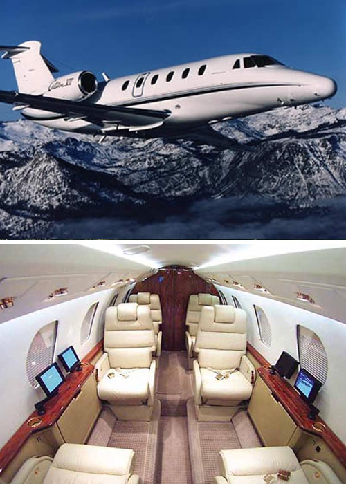 The Citation VII Private jet has eight passenger fire-blocked interior features a two-place divan opposite the cabin door, a center club and two forward-facing seats in the aft cabin. For your entertainment - CD Player, Speakers and Headsets. Citation VII has a range of about 2000 s.m. and cruise speed of 527 MPH.