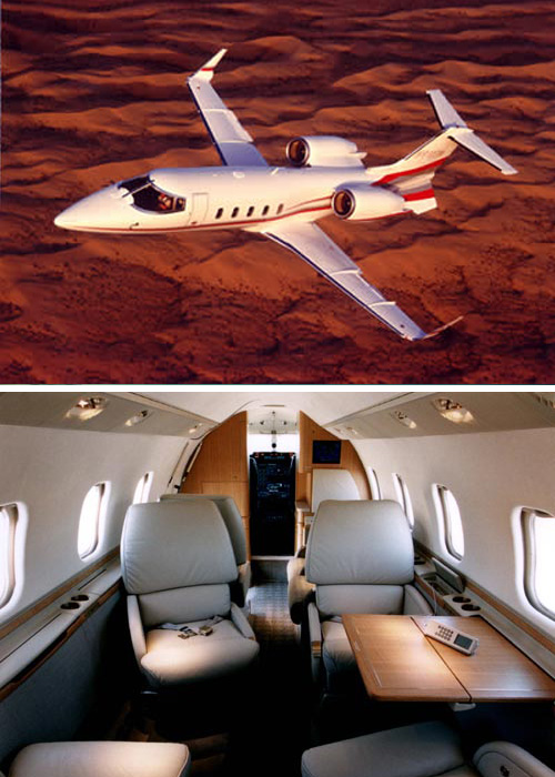 The Lear jet 35 Private jet includes comfortable accommodations for seven or eight passengers featuring five leather armchairs and a two place divan in the rear. The Lear jet 35 can cover up to 2300 statute miles in a single flight and has cruise speed of 500 MPH.