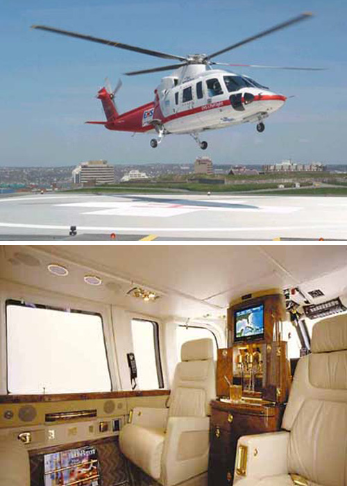 The Skikorsky S76A Executive Helicopter is the perfect way to travel fast on short distances - up to 450 statute miles to a landing spot of any kind. The interior features comfortable leather seating for four to six passengers. Skikorsky S76A travels at cruise speed of 178 MPH.